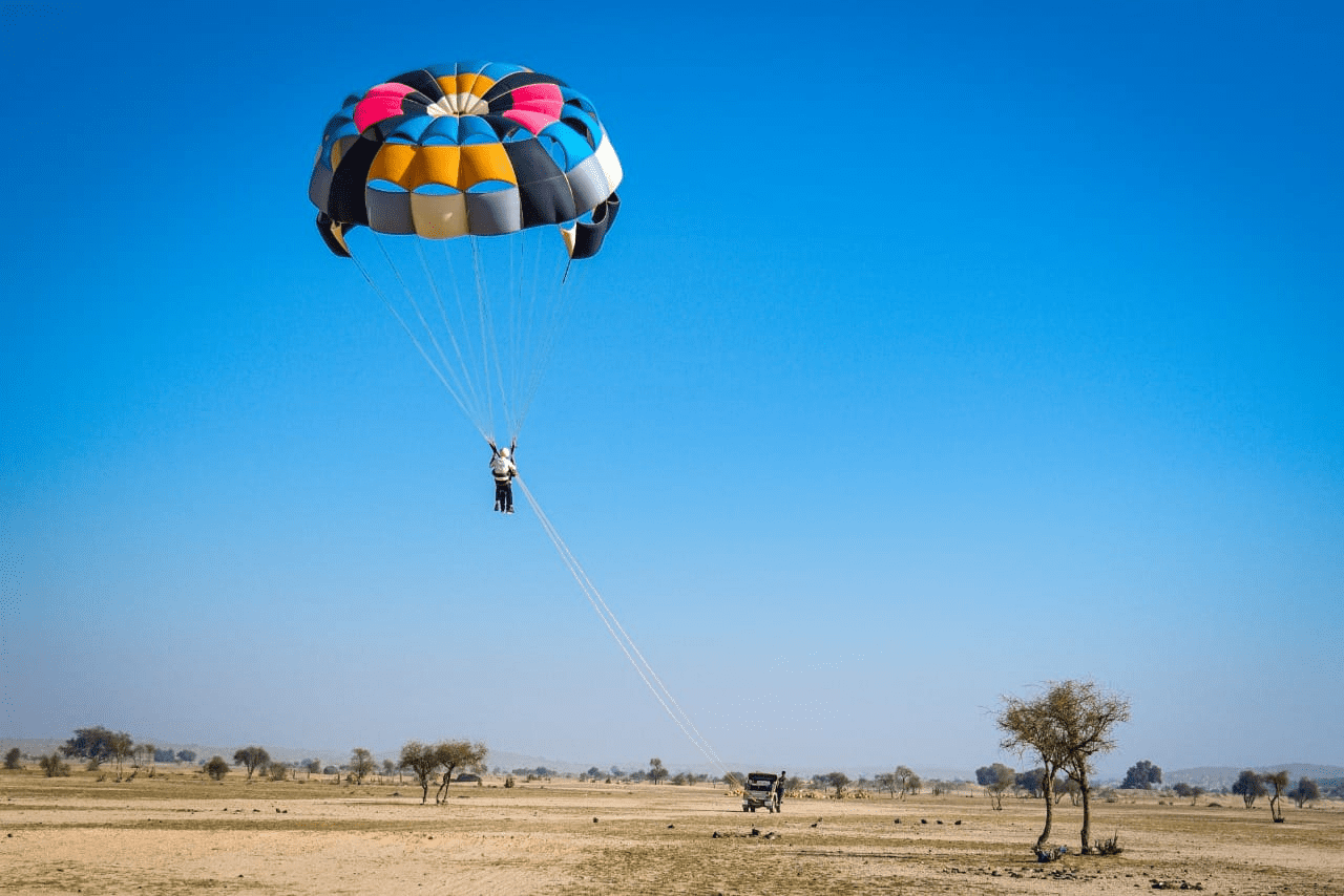 Parasailing in Jaisalmer is a good start for anyone who has a fear of flying. With the landing over the desert of Jaisalmer, there is much less possibility of an accident. Anyone above the age of 5 years is eligible to take up this sport. Fly in the sky and over the mystic sand dunes from the top that look like golden silk from the sky.